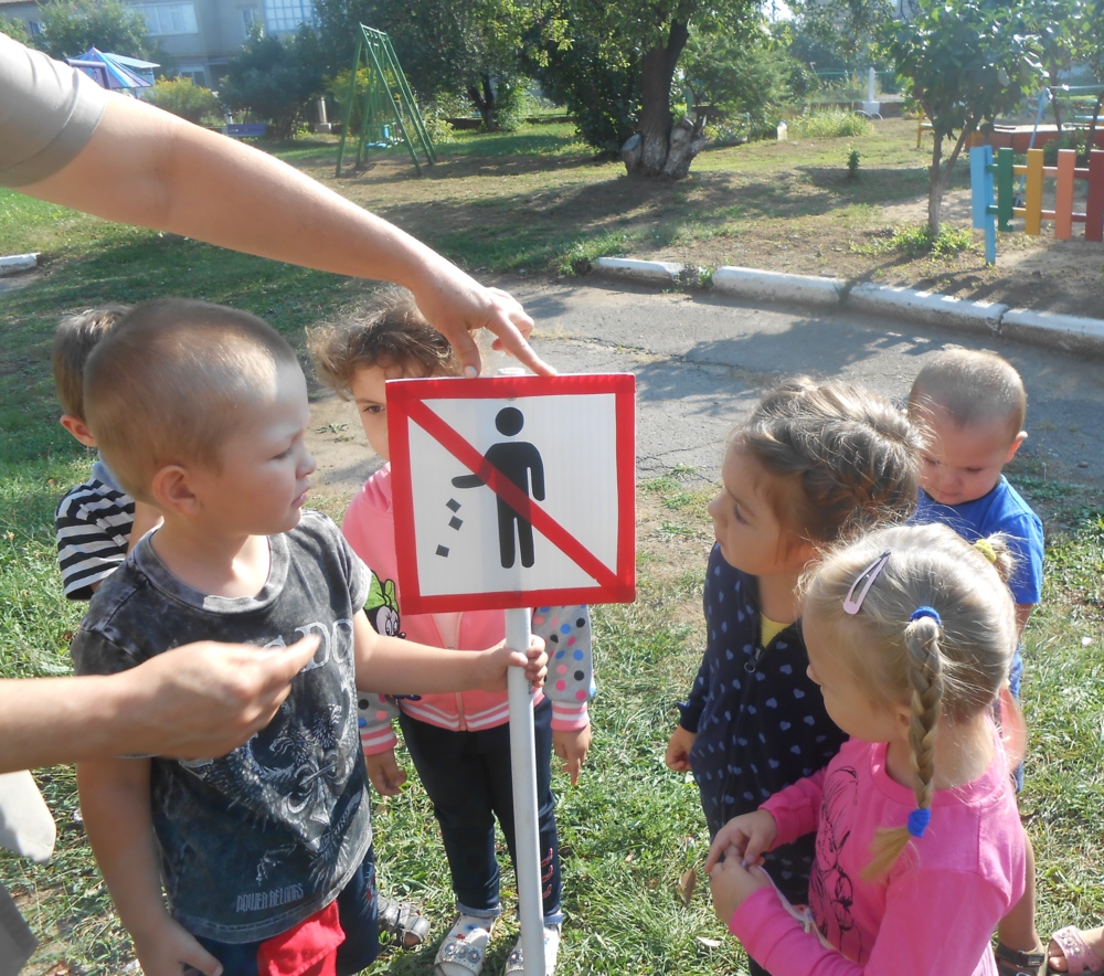 Мы приготовили вот такую листовку (показываю) с таким знаком, где просим и напоминаем всем, чтобы не сорили и выносили мусор в положенные места. Предлагаю раздать ее всем взрослым во дворе детского сада. Вы мне поможете? Наденем галстуки и кепки, на которых написано «Солнечный», что бы нас сразу заметили.